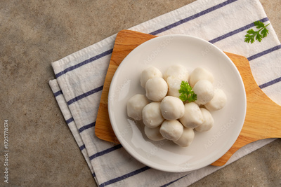 Uncooked Thai Pork meatballs on white plate.Top view with copy space.