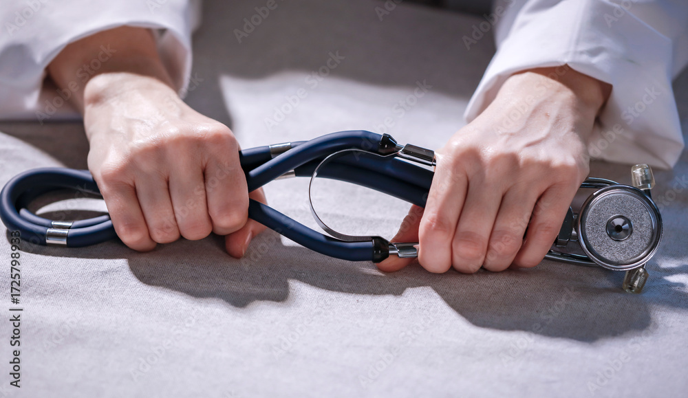 Close-up of doctor’s hands holding stethoscope on desk, wearing white medical coat. Professional healthcare concept symbolizing trust, medical consultation, diagnosis, prevention and patient care.