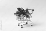 A miniature shopping cart and red gift box on a white background, Black Friday or holiday shopping