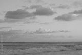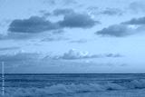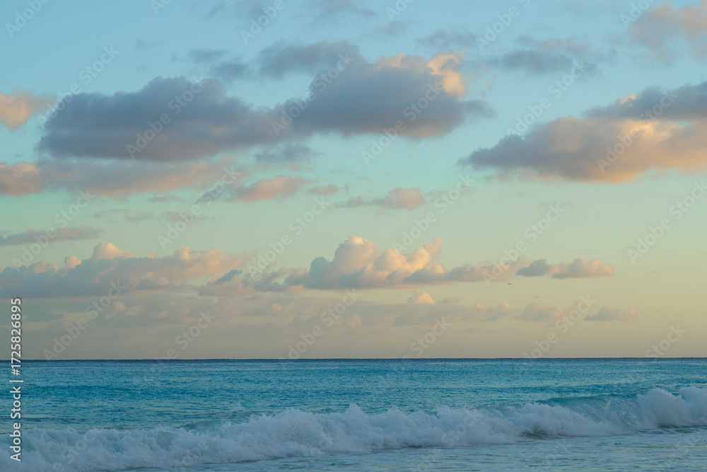 Calm ocean waves under pastel sunset sky with soft clouds. Peaceful seascape view of turquoise sea and golden light on the horizon, nature background.