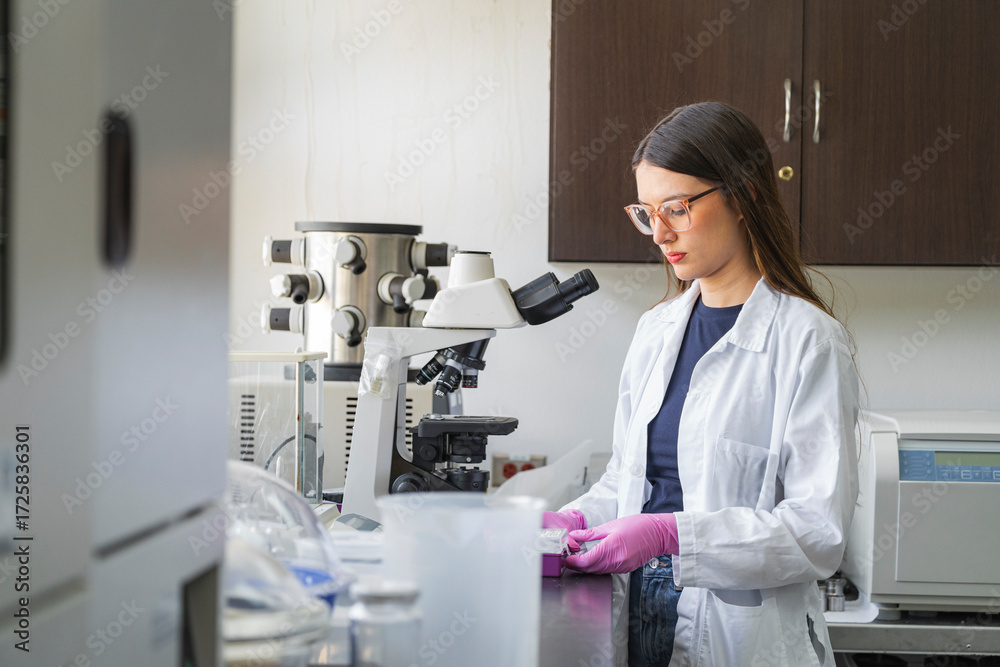 Young scientist working with microscope in university laboratory