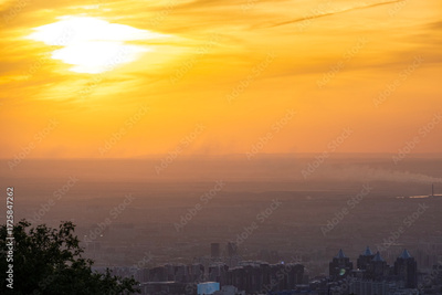 Almaty city at sunset, photographed from the mountains.May 10, 2025, Almaty, Kazakhstan