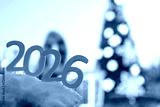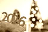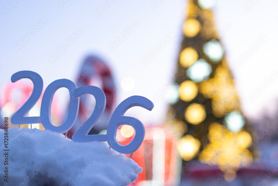 Numbers 2026 on the background of a Christmas tree. Concept of the new year and Christmas 2026.
