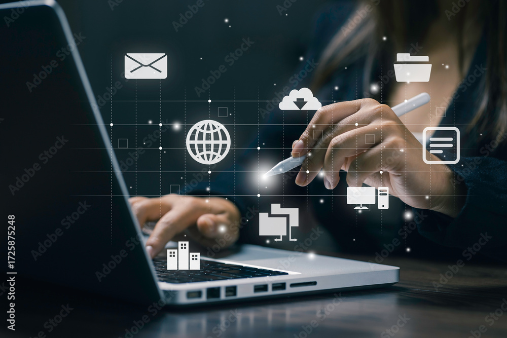 Hands using laptop with digital icons of email, cloud, files, and internet, representing data management, online communication, cloud storage, and modern business technology.