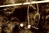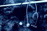 A stethoscopes hank on a clothesline in garden.