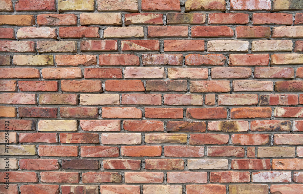 Ziegelstein Wand aus alten, verschiedenfarbigen Klinkersteinen mit grob gearbeitetem Mörtel - Teil einer Fassade in Nahaufnahme