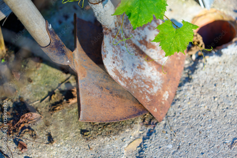 Two Rusty Shovels with Green Leaves