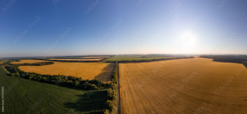 Wide panorama of agriculture fields in Ukraine with green and golden tones across fertile farmland under summer sun