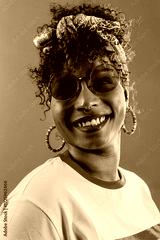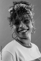 Young woman wearing rainbow t-shirt and pink sunglasses is smiling and looking away