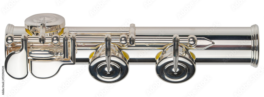 Flute Instrument. Silver-plated nickel student flute with closed and open holes. Professional musical instrument for school band, concerts. Classic orchestra flute instrument. Close-up high resolution