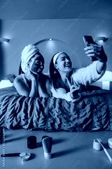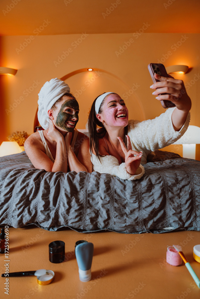 Two happy women taking selfie while wearing beauty masks in bedroom