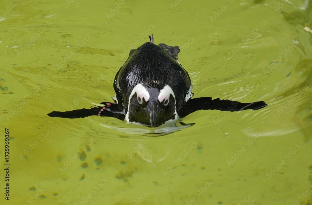 Frontal close up of a cute African penguin (Cape penguin, Spheniscus demersus) swimming in the South African water, focus on flippers, beak, and face