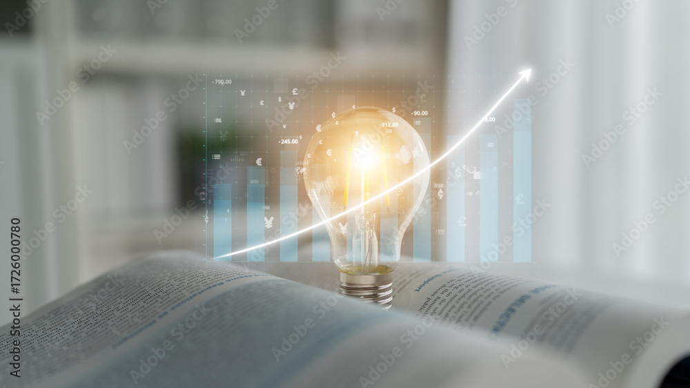 A bright light bulb glows above an open book, with a rising graph chart in the background, representing the concepts of knowledge, innovation, and growth in today world. Impute