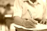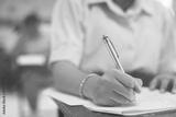 Closeup to hand of student holding pen and taking exam in classroom with stress for education test .