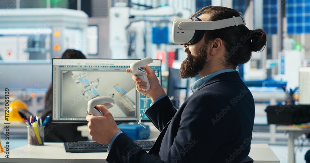 Photovoltaics factory worker using VR headset to monitor performance of robot arms placing solar panels on assembly lines. Expert inspecting solar plant machinery using virtual reality technology