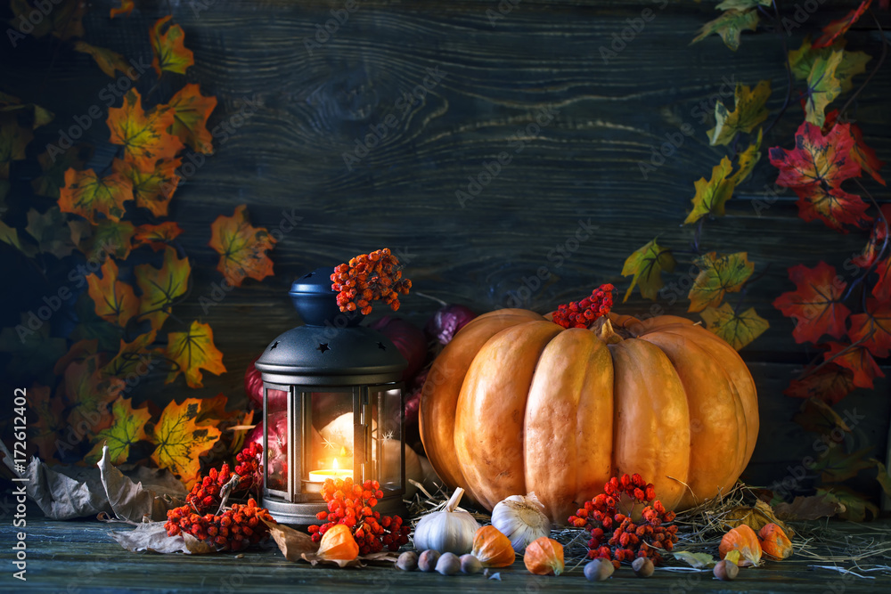 The wooden table decorated with vegetables, pumpkins and autumn leaves. Autumn background. Schastlivy von Thanksgiving Day.