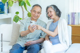 リビングでスマホを見るシニア夫婦