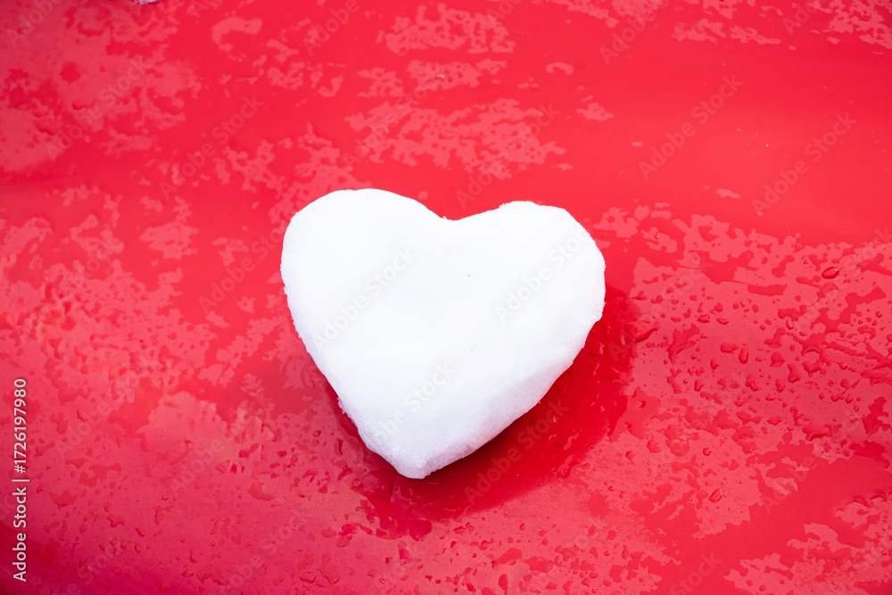 Heart-shaped snow sculpture resting on a vibrant red surface, showcasing a playful winter theme with contrasting colors and textures, symbolizing love and warmth in cold weather