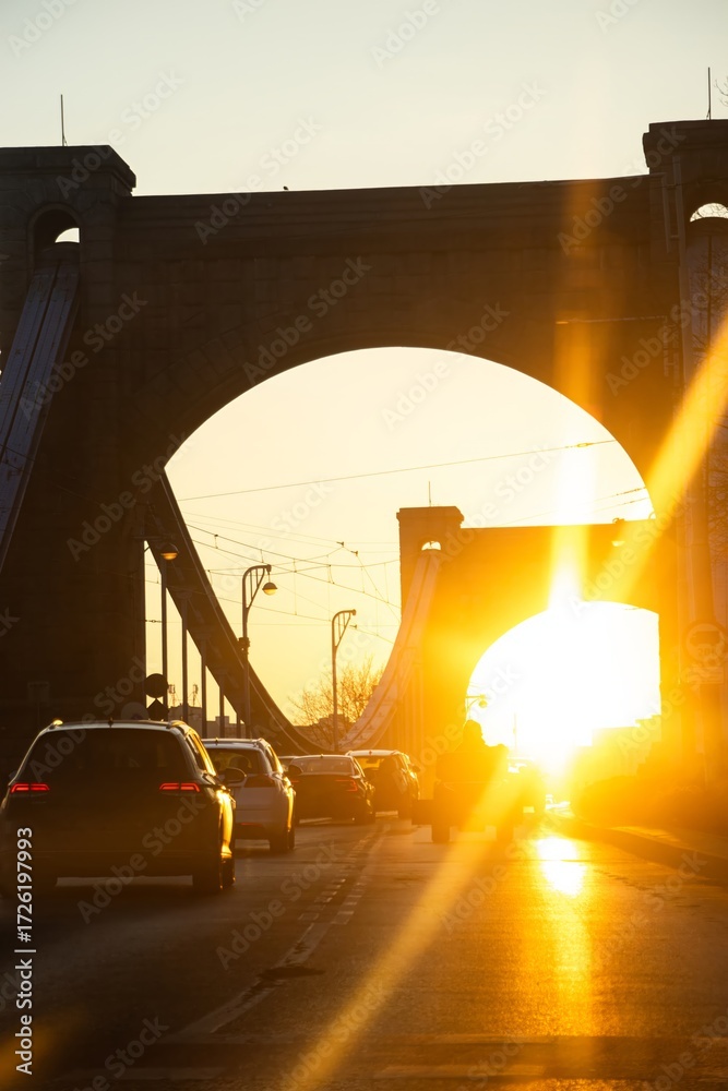 Sunset view through a large archway bridge, with vehicles driving on the road, illuminated by warm golden light, creating a serene urban atmosphere and captivating scene