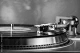 Vinyl record player, bright lights disco-bokeh. Needle on vinyl record.