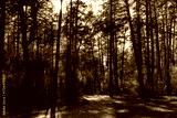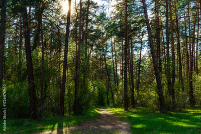 Forest path winding through green trees. Sunlit park landscape. Outdoor escape and natural scenery for relaxation.