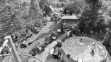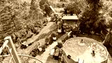 Garden of a suburban house in summer in which you can see a removable swimming pool, pergola in a place with a lot of vegetation.