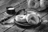 Homemade donuts with sugar powder on black serving board and in frying basket served with vintage sieve on old wooden plank table. Rustic style.