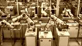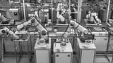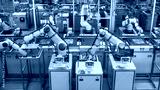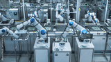 Innovative Manufacturing Factory with Industrial Robots Producing Circuit Boards in an Automated Factory. Advanced Facility Building Microelectronics Components with Robotic Arms