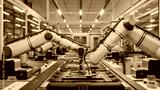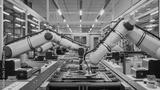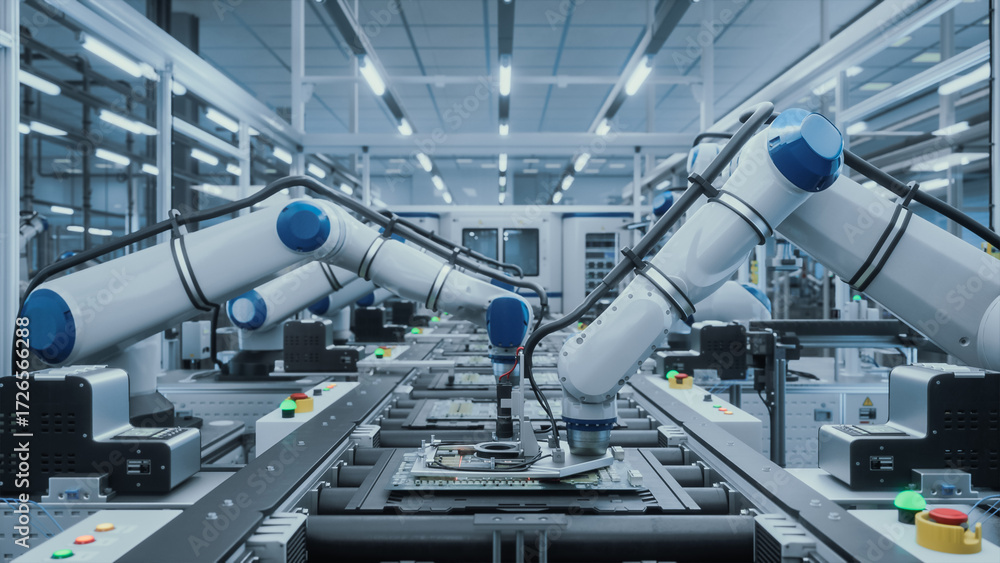 Robotic Arms Automate Circuit Board Assembly Inside a Smart Factory. Factory Floor with Automatic Conveyor is Powered by an Artificial Intelligence Software Without Human Help and Assistance