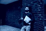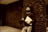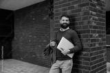 Portrait of cheerful businessman leaning on a wall with laptop and takeaway coffee while smiling at the camera.
