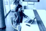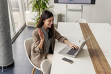 Smiling Businesswoman in Modern Office Setting Engaged in Video Call at Workstation