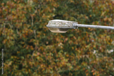 Rain falling on a street lamp post. Above point of view, close up telephoto shot, daytime, no people