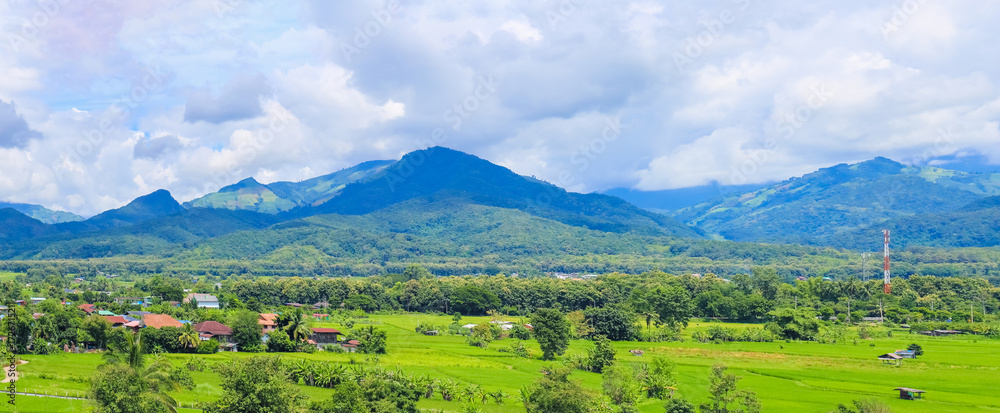 Landscape of Pua District, Nan Province, rice fields and mountains, North of Thailand
