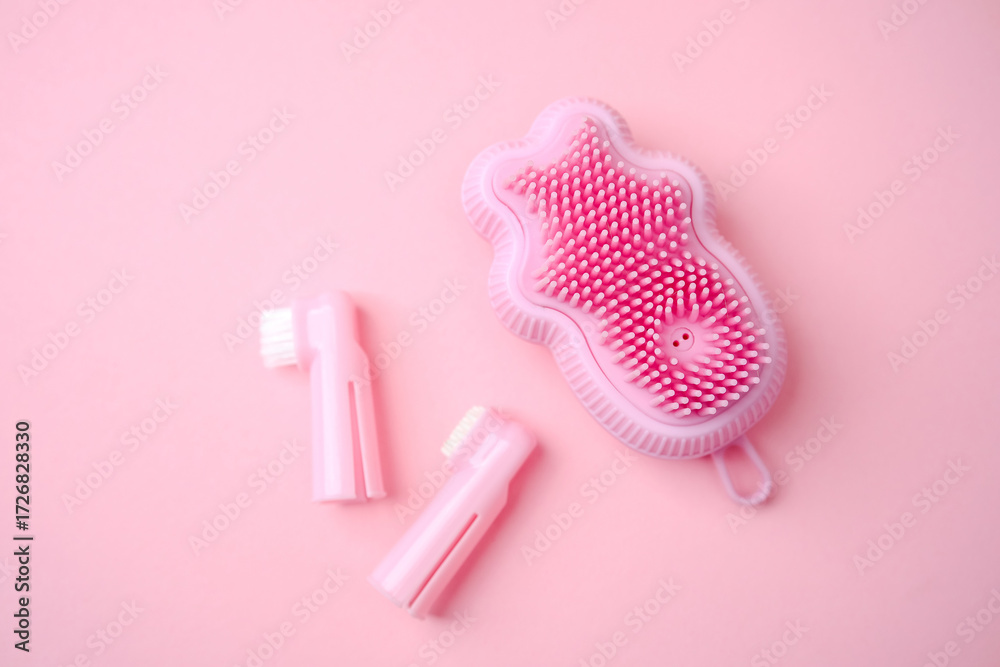 Pink dog paw bath brush and finger toothbrushes for pet cleaning on a pastel background.