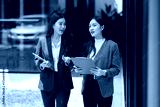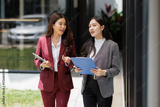 Two Asian business people walking street at business office center.Young business corporate team meeting in a business park.Leadership,coaching and group of people Discuss meeting