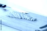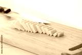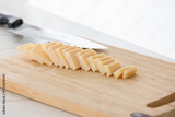 Parmigiano. Row of pale cheese slices neatly fanned on a wooden cutting board