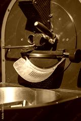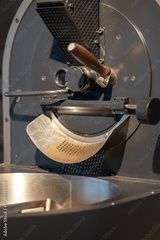 Close-up vertical photography of a coffee roaster featuring a metal drum