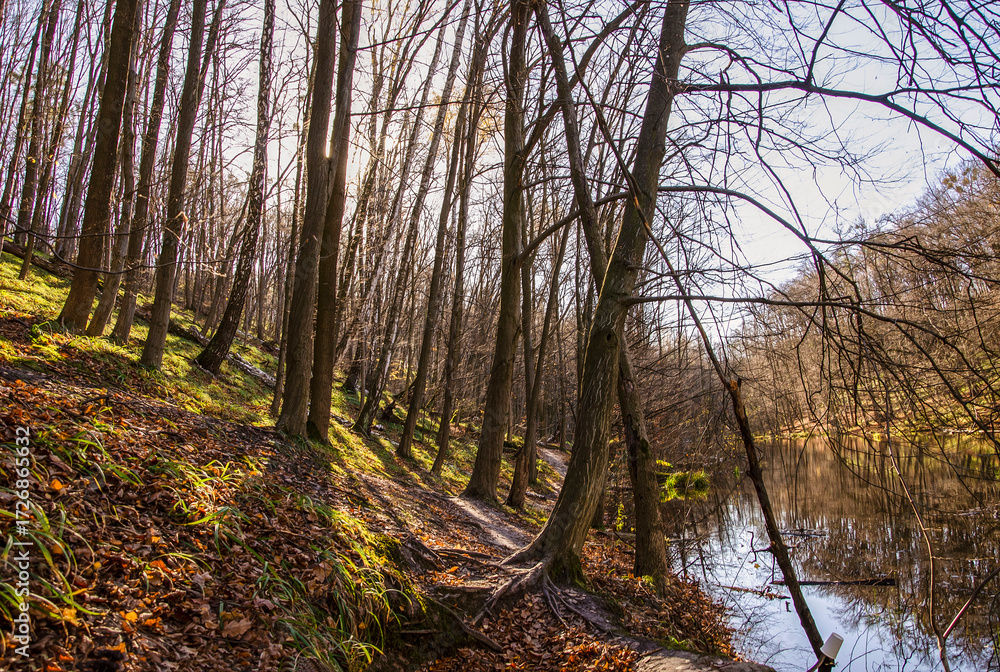 Late autumn in the forest. Autumn landscape in the ancient Kitaevska Hermitage. Kyiv, Ukraine.
