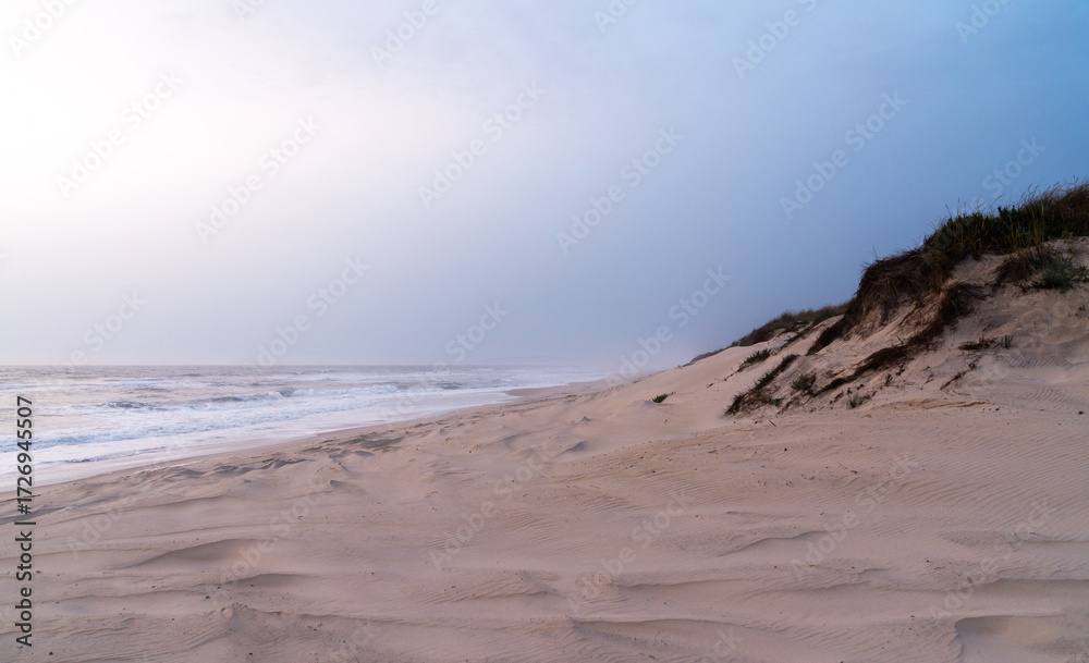 A serene, sandy beach with gentle waves against the shore under a soft, pastel sky. Dunes with sparse vegetation rise gently from the beach, creating a peaceful and untouched natural landscape.