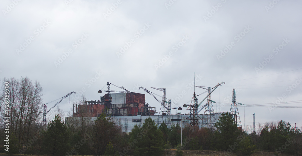 Chernobyl Nuclear Power Plant amidst forest, under gray sky, displaying towering industrial structures for operational functionality.