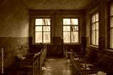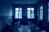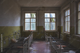 Desolate room in Chernobyl Nuclear Zone, with abandoned cots amidst chaos. Peeling paint and debris evoke a somber atmosphere. Possible old hospital setting, in decay.