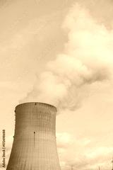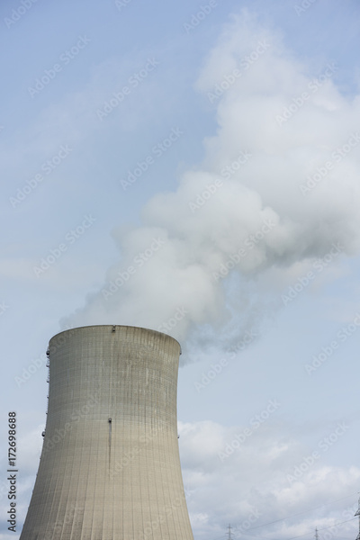 nuclear power plant chimney with condensation smoke on a cloudy day