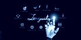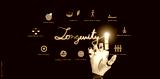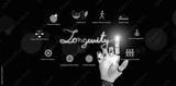 Futuristic AI robotic hand highlighting glowing longevity text with icons of healthy habits such as sleep, diet, exercise, and stress management, symbolizing wellness, healthcare, innovation.