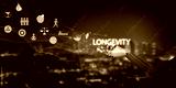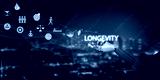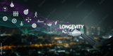 Futuristic AI robotic hand holding glowing longevity text with icons of healthy lifestyle, balance, nutrition, and wellness, symbolizing innovation, healthcare technology, extended human life.
