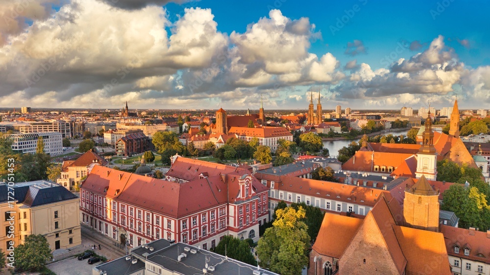Golden Hour Aerial View of Ostrów Tumski in Wrocław with Gothic Cathedral, Tumski Bridge and Historic Architecture by the Oder River, Poland