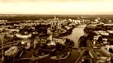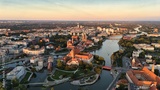 Golden Hour Aerial View of Ostrów Tumski in Wrocław with Gothic Cathedral, Tumski Bridge and Historic Architecture by the Oder River, Poland