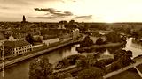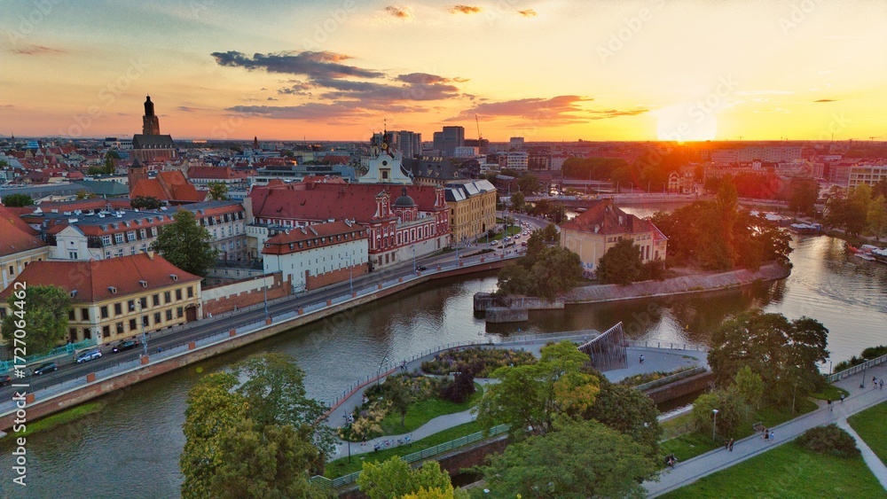 Golden Hour Aerial View of Ostrów Tumski in Wrocław with Gothic Cathedral, Tumski Bridge and Historic Architecture by the Oder River, Poland