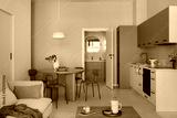 Open-plan living space with grey kitchen cabinets, round dining table and orange chairs.