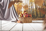 Autumn wicker basket with apples on white wooden table and autumn forest background.