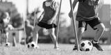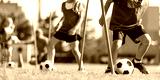 School boy dribbling soccer ball in slalom training drill. Football training camp for school kids. Soccer practice equipment on grass pitch